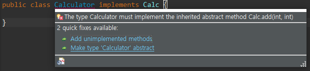 우선은 문제 해결 1번의 Add umimplemented methods 옵션을 클릭하여 Calc 인터페이스에 선언한 4개 추상 메서드 중 add()와 abstract() 2개만 구현하여 추상 클래스로 만든 후 이를 상속하는 클래스를 만드는 과정으로 구현해보겠습니다.