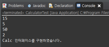 num1(10)과 num2(5)를 덧셈, 뺄셈, 곱셈, 나눗셈 연산한 결과 값을 출력했습니다. 8행을 보면 구체적인 클래스인 CompleteCalc 클래스만 인스턴스를 생성할 수 있고 Calculator 클래스는 추상 클래스이므로 인스턴스를 생성할 수 없고, Calc 인터페이스는 추상 메서드만으로 선언되었기 때문에 인스턴스를 생성할 수 없습니다.