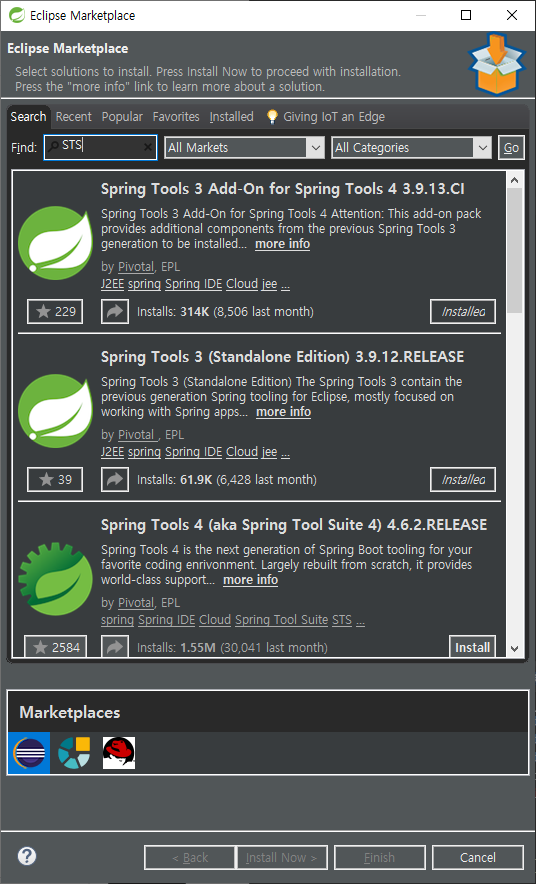 혹은 이클립스의 Help > Eclipse Marketplace로 들어가 STS를 검색하여 설치하는 방법도 있습니다.
