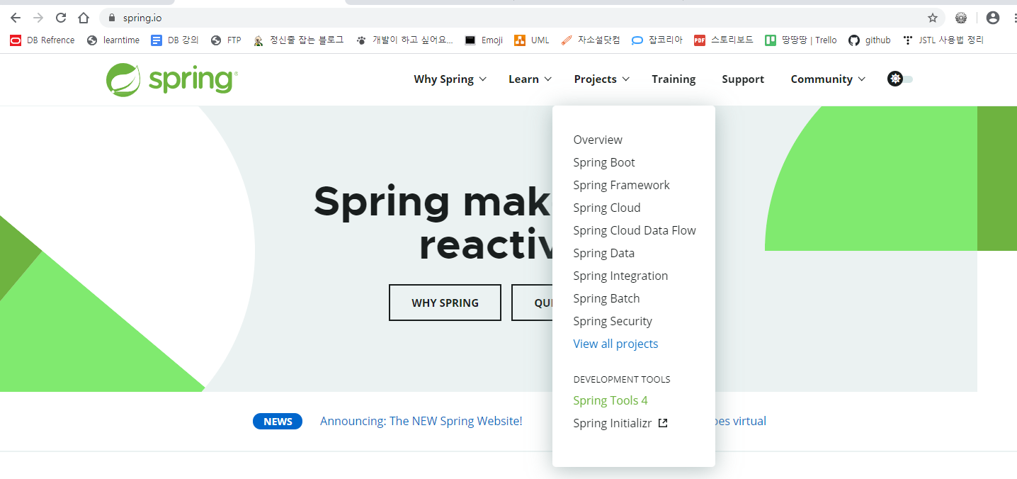 위 스프링 공식 사이트로 접속하여 Projects > Spring Tools 4 페이지로 연결합니다.