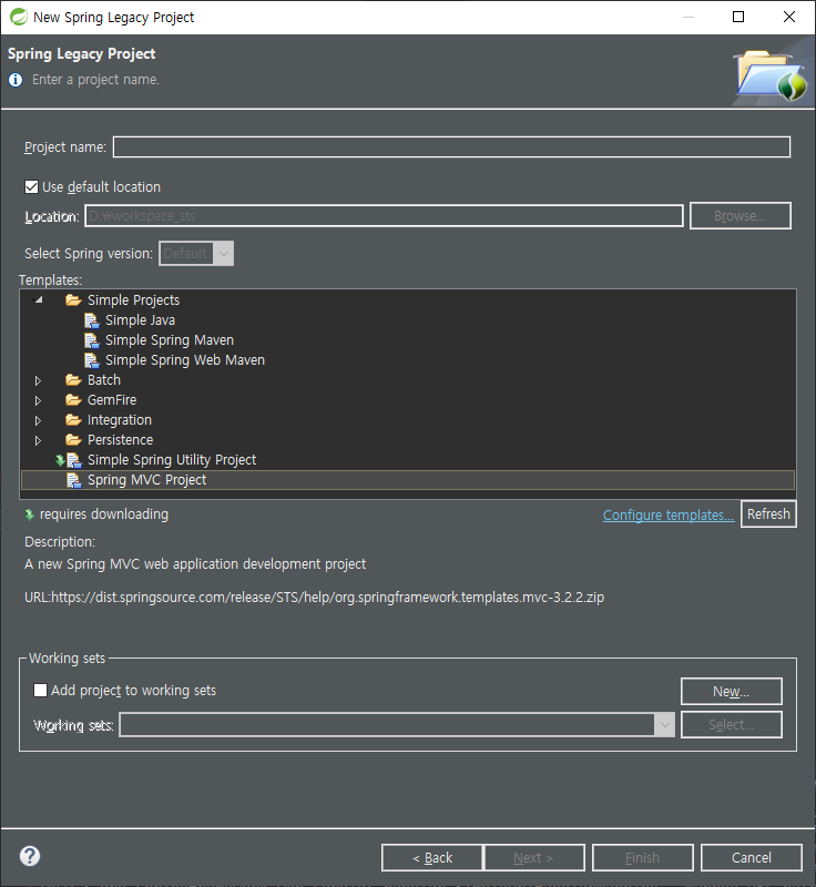 템플릿은 Spring MVC Project로 선택하고 프로젝트명을 입력하고 Next 버튼을 클릭해줍니다.
