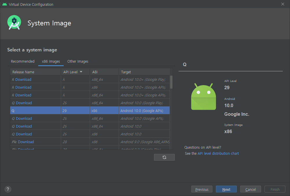 상단 x86 Images로 들어가면 Q의 Download 문구가 없고 API Level이 29이며 ABI가 x86인 버전을 선택 후 Next 버튼을 클릭합니다.