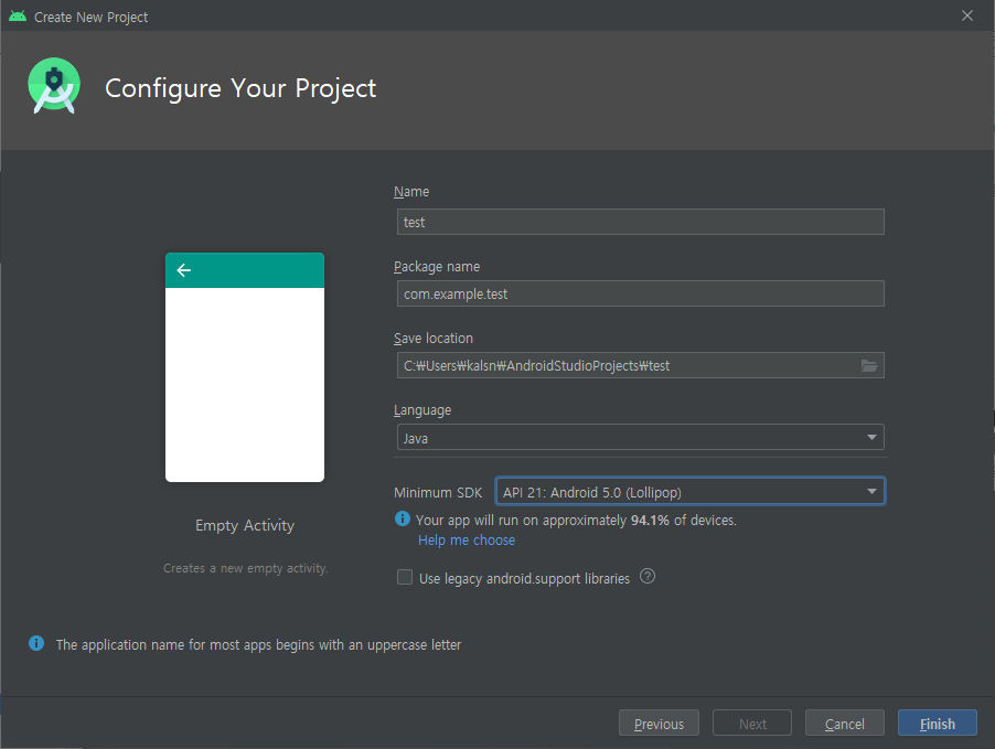 프로젝트, 패키지의 이름을 입력하고 Language는 Java로 선택 후 Minimum SDK는 'API 21: Android 5.0 (Lollipop)'으로 프로젝트를 하나 생성하겠습니다.
