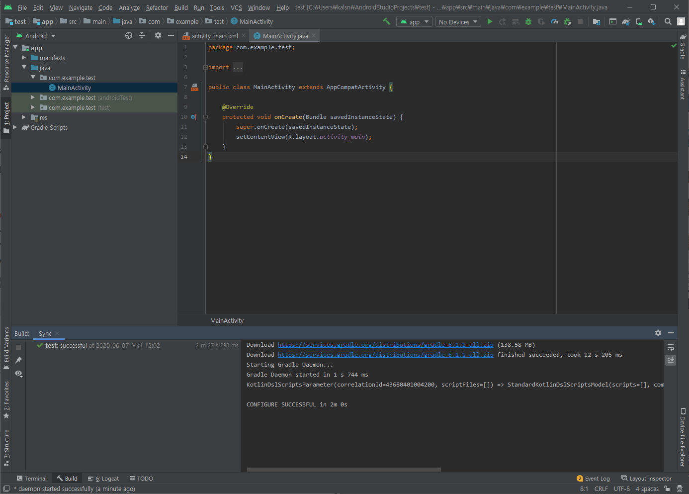 프로젝트 첫 생성 시 우측 하단의 게이지바 또는 프로세스 러닝이라는 메시지가 보이고 좌측 하단의 Build 탭을 눌러보면 자동 초기 세팅이 이뤄지는 진행 상황을 보실 수 있습니다.