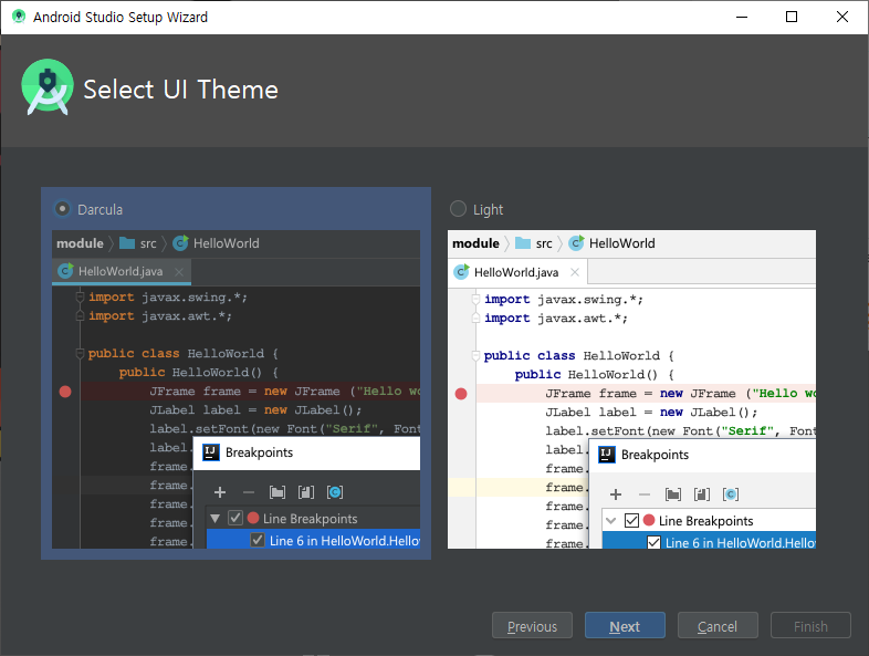 다크/화이트 테마 중 원하는 컬러의 테마를 선택하고 Next 버튼을 클릭합니다.