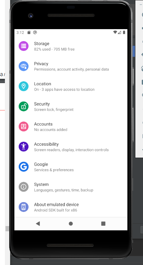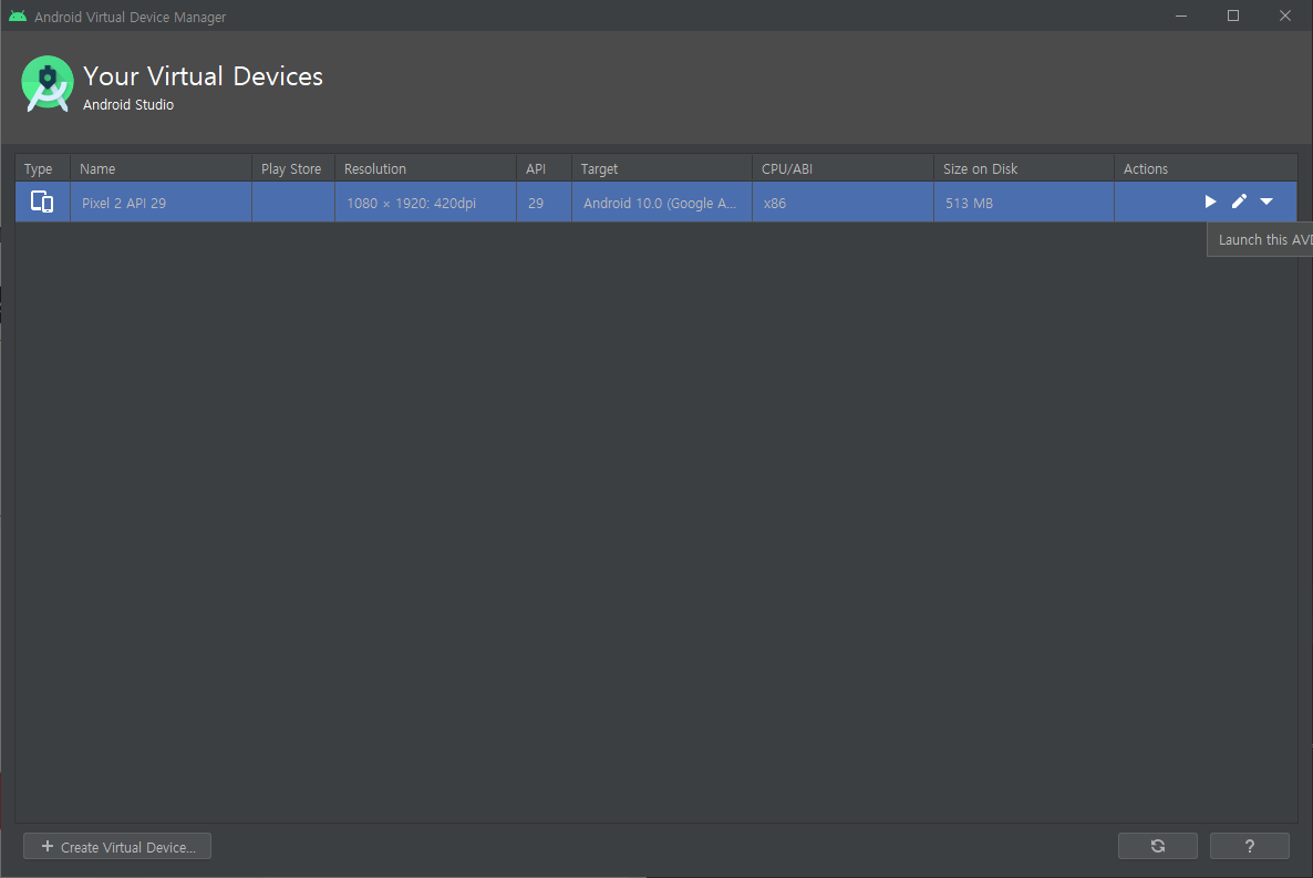 최종적으로 생성이 완료된 화면입니다. Actions에 ▶ 버튼을 클릭하여 디바이스를 실행 시켜줍니다.