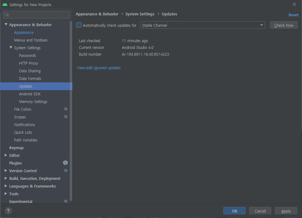 Appearance & Behavior > System Settings > Updates에서 Automatically check updates for (자동 업데이트) 체크를 해제 후 Apply 클릭 후 OK 버튼을 클릭하여 빠져나옵니다.