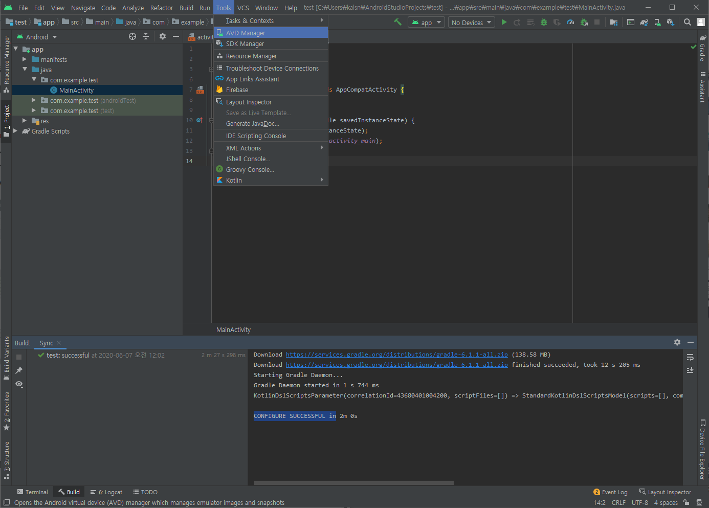 현재는 AVD가 하나도 없는 상태이므로 Tools > AVD Manager로 들어갑니다.
