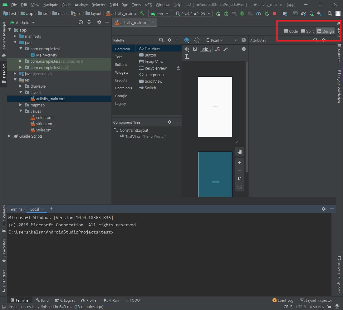 레이아웃은 res > activity_main.xml에서 하는데 첫 실행 시 Design 탭에서만 보여지고 있습니다.