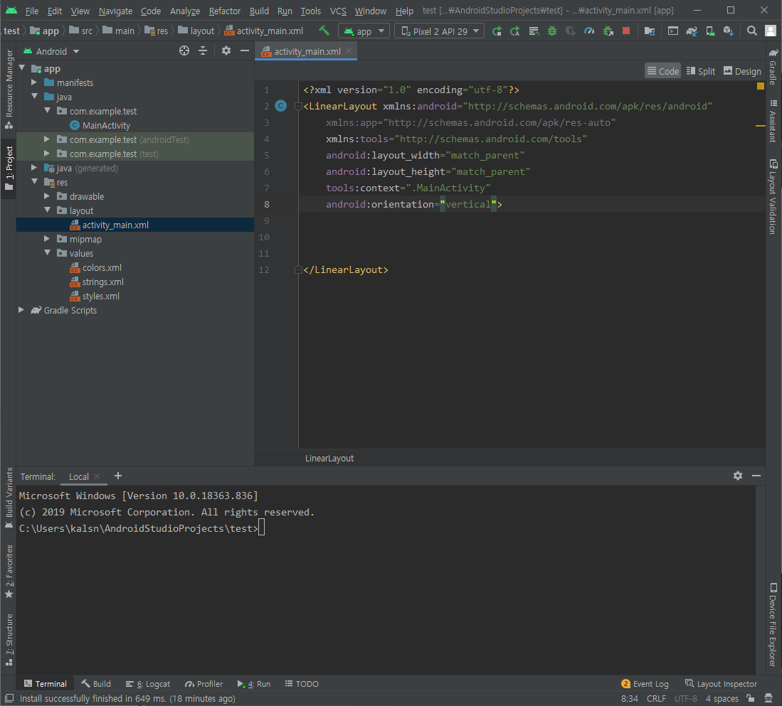 우선 레이아웃은 LinearLayout으로 변경해줍니다.