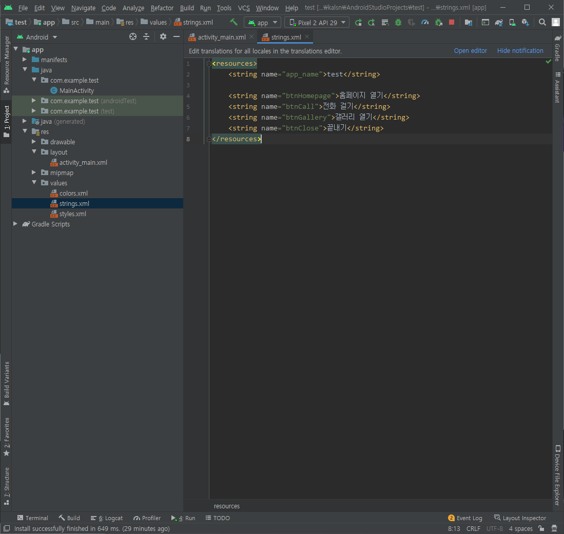 위와 같이 activity_main.xml에서 지정해준 string 이름과 똑같이 지정 후 문자열을 지정해줍니다.
